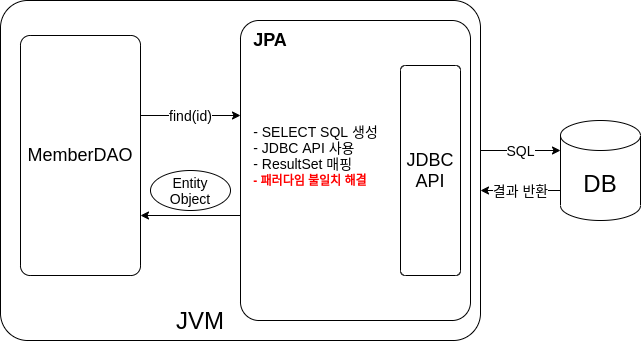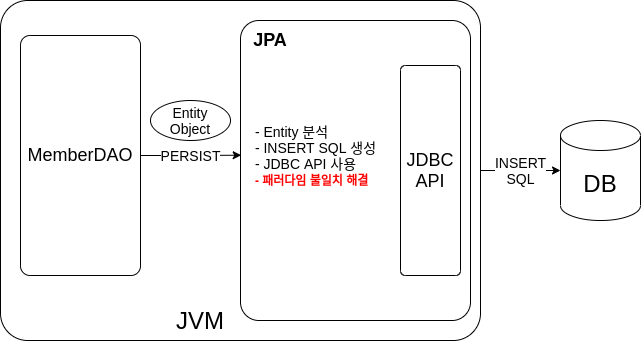 이 과정을 통해 JPA는 저장과 조회 작업을 수행합니다. 특히, JPA의 가장 중요한 역할은 객체 지향 프로그래밍과 관계형 데이터베이스 간의 패러다임 불일치를 해결하는 것입니다.