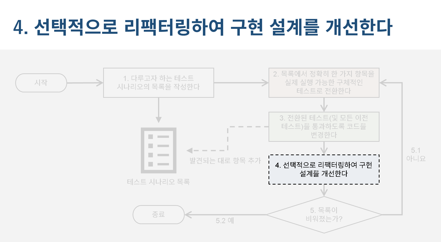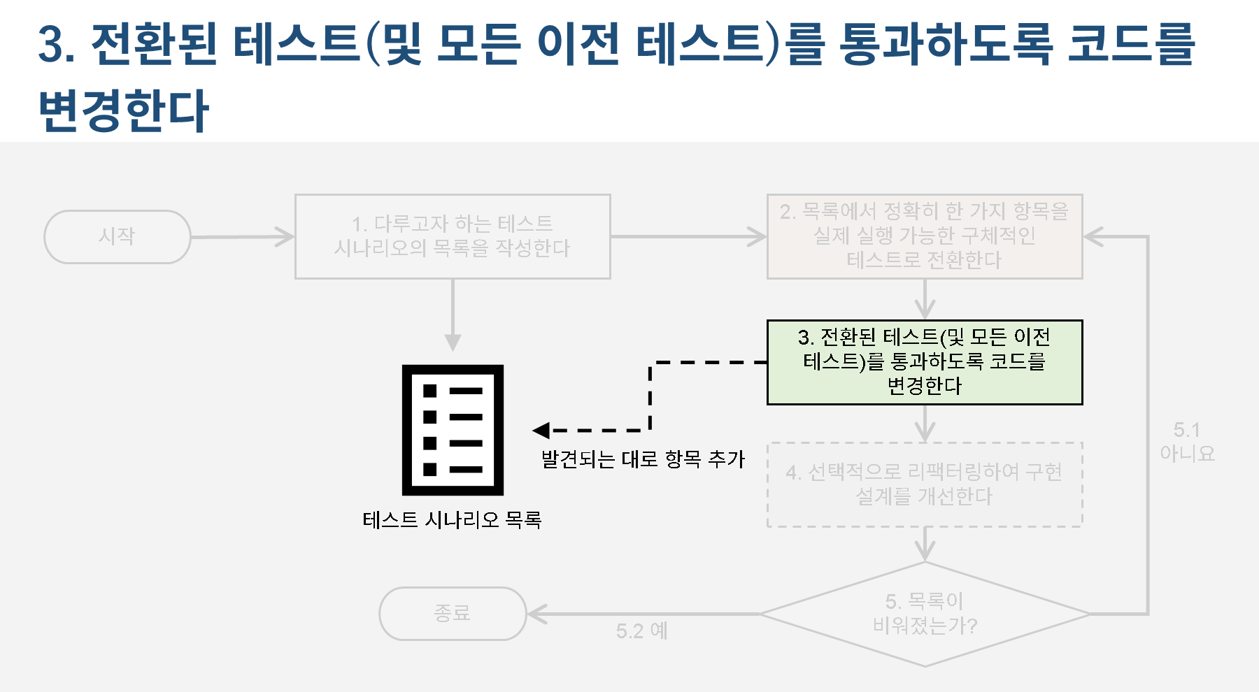 - 테스트 통과를 위한 운영 코드 변경: 새 테스트와 기존 테스트 모두 통과하도록 코드 수정. 새로운 시나리오 발견 시 목록 추가.