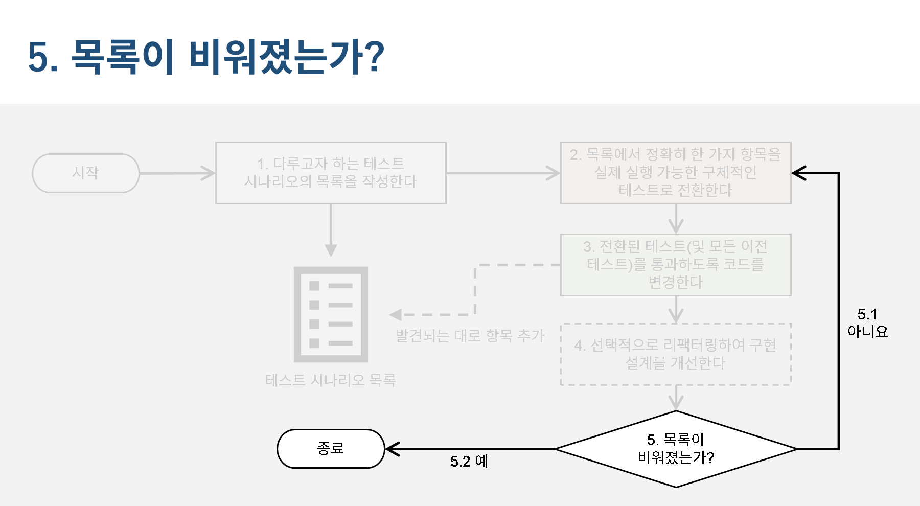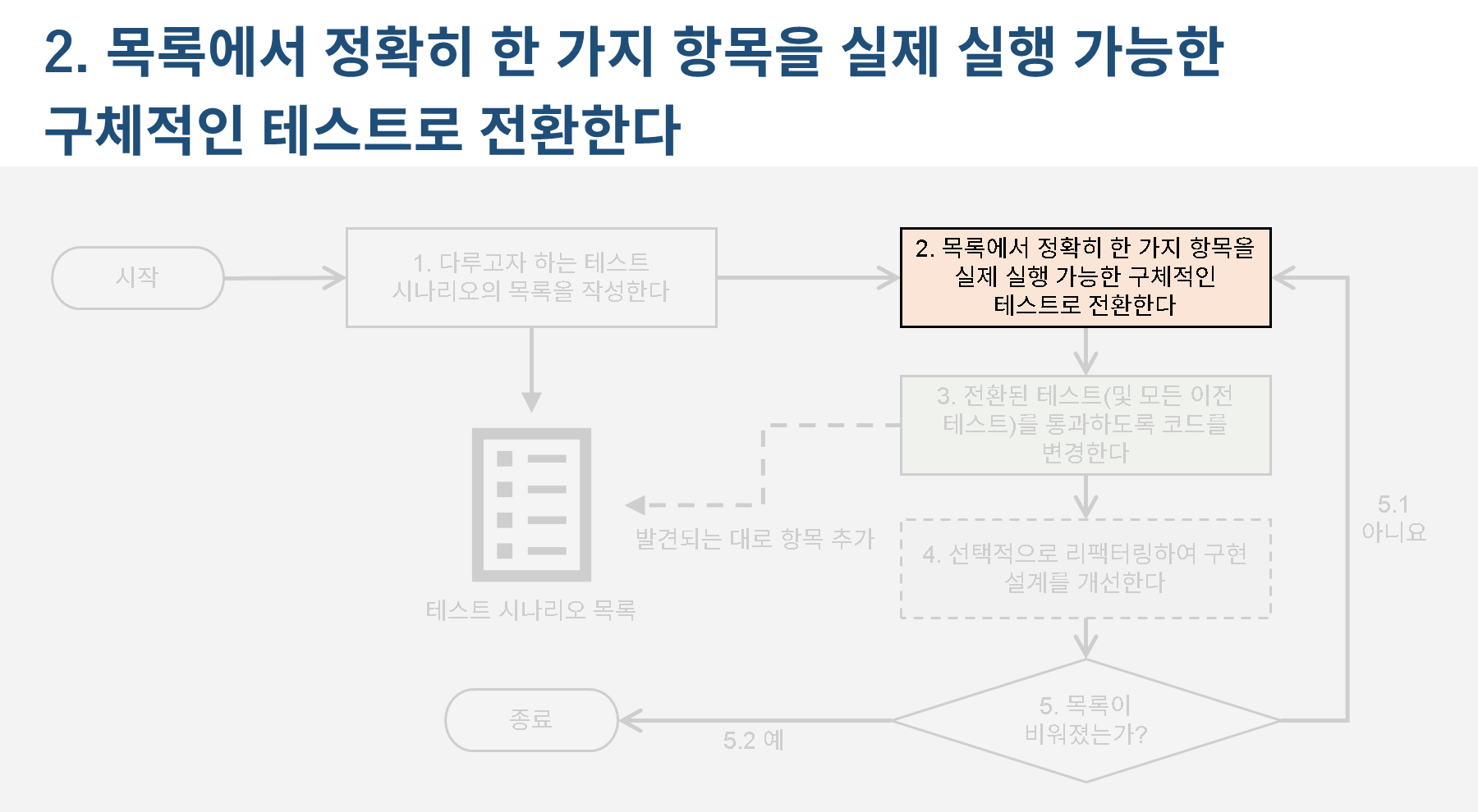 - Kent Beck의 강조: 많은 사람이 이 단계를 놓치지만, TDD의 성공에 핵심적입니다. 목록이 없으면 테스트가 산발적입니다.