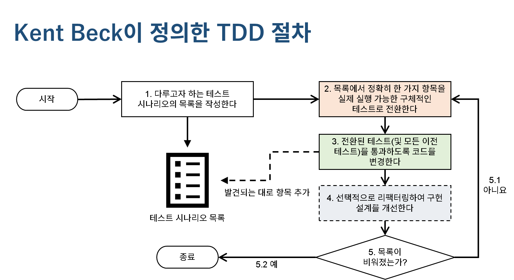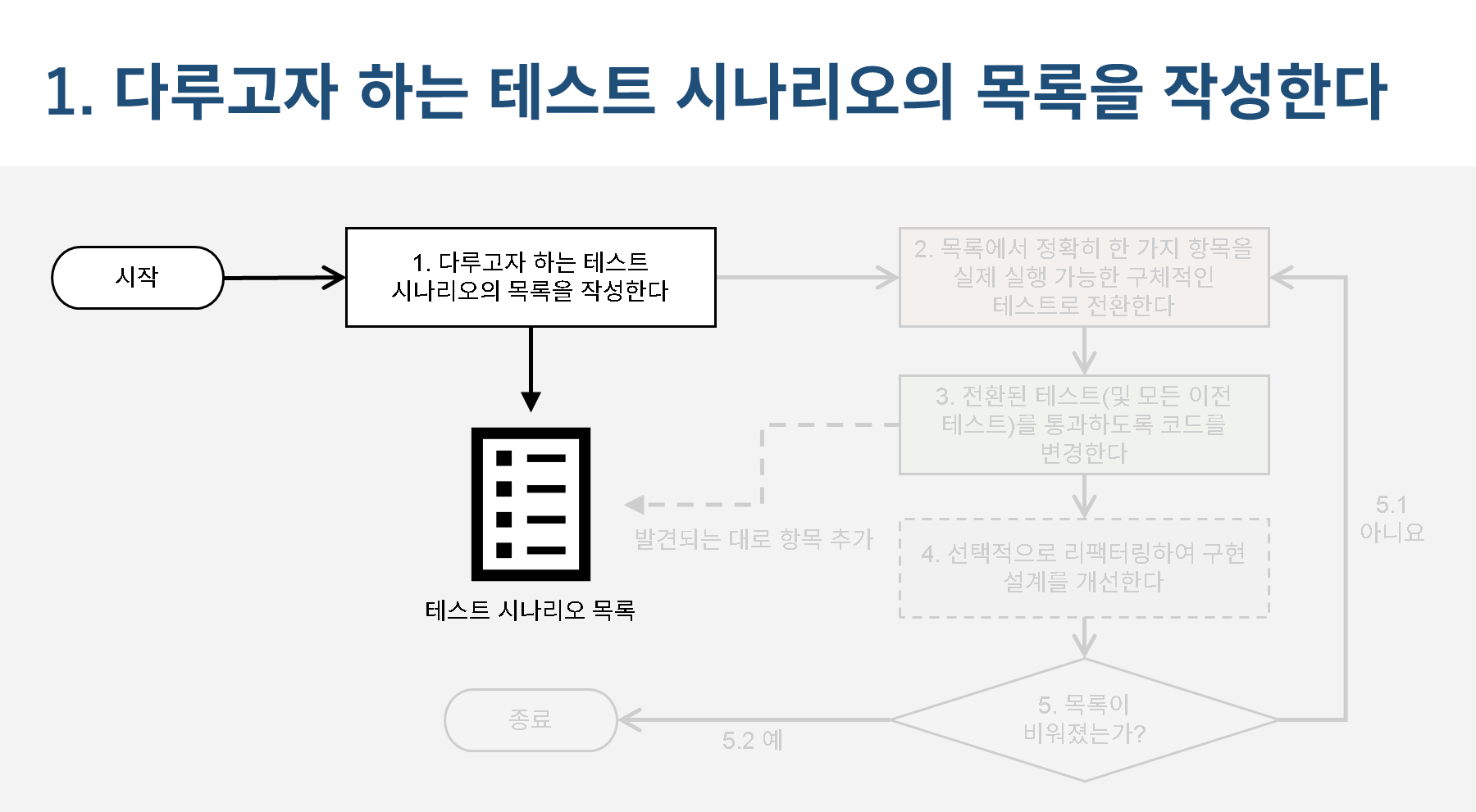 - 실행 팁: 모든 시나리오를 brainstorm처럼 나열. 신입·주니어 개발자는 이 목록을 선임자에게 리뷰 요청하면 좋습니다. 목록은 TDD 과정뿐만 아니라 전체 개발에 활용됩니다.