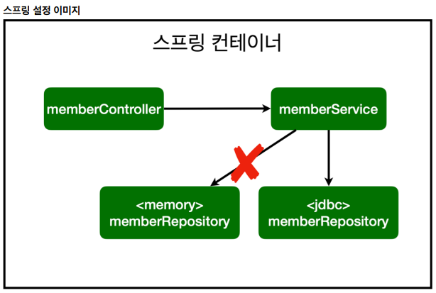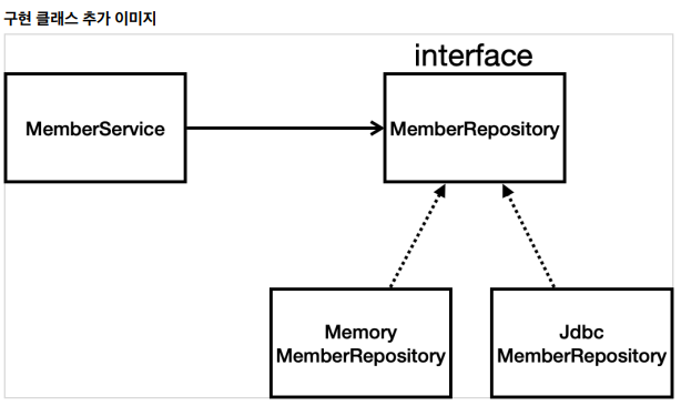 그리고 MemberRepository 인터페이스는 이제 MemoryMemberRepository와 JdbcMemberRepository 구현체를 가지게 됩니다. 기존에는 MemoryMemberRepository를 Spring Bean으로 등록하고 사용하고 있었습니다.